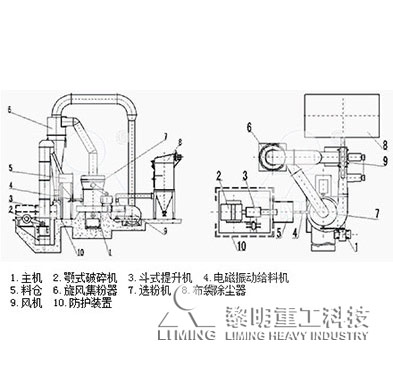當主機電機通過傳動裝置帶動主軸轉動時,裝在鏟刀架上的鏟刀與磨輥同步旋轉,磨輥在磨環內圓滾動的同時繞自身軸自轉。電動機通過傳動裝置帶動分析機旋轉,葉輪轉速越高,分選出的粉子越細。為保障磨機在負壓狀態下工作,增加的氣流量通過風機與主機間的余氣管排入布袋除塵器,被凈化后排入大氣。