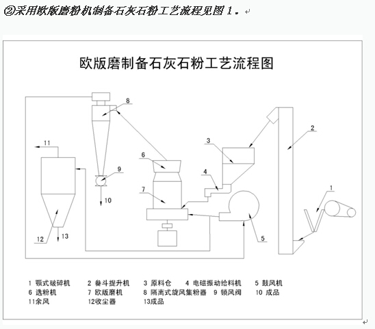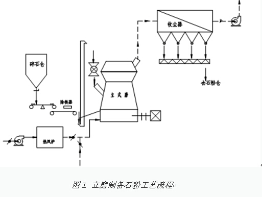 經(jīng)破碎后的石灰石由庫底調(diào)速皮帶秤計量配料后,由皮帶輸送機喂入立磨進行粉磨,成品為細度250目石灰石粉。粉磨后的石灰石粉經(jīng)輸送機送入成品庫儲存。儲庫庫頂設(shè)有單機收塵器除塵。