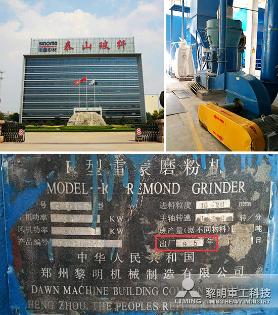 今年的走訪活動中,更令人稱道的是:中國中材泰山玻璃纖維有限公司,一臺由黎明重工于1995年生產,迄今投產21年之久的磨粉機仍在為客戶效力,并保持正常運行。進入整潔規范的客戶生產現場,這臺藍色的雷蒙磨粉機正在有條不紊地作業進行中。與目前以灰白為主色調的新一代磨機外殼體大氣的外觀不同,雷蒙磨的藍色機身顯得清新活力。但是機身上面斑駁的銘牌依然告訴我們,這已經是一員“老將”了。銘牌雖然斑駁,但上面各項功率、型號及生產日期還清晰可見。通過上面的文字,我們了解到這臺R型雷蒙磨粉機生產于1995年,型號是雷蒙磨粉機3216型。在與客戶聊天中,走訪人員了解到這臺磨機加工的物料是葉臘石,盡管已經使用二十余年,仍然正常運行沒有出現重大問題。