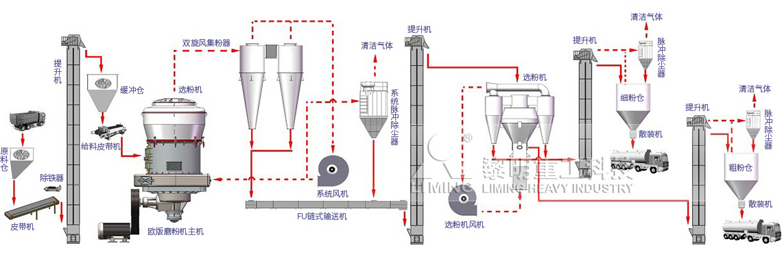 無論是采用爐內(nèi)脫硫還是采用爐外煙氣脫硫的脫硫方式,均需要磨制不同粒級(jí)的石灰石粉。根據(jù)CFB鍋爐的脫硫特點(diǎn),黎明重工研發(fā)出一種新型的脫硫制粉設(shè)備和工藝。在原來僅對(duì)爐外煙氣脫硫石粉的工藝擴(kuò)展為同時(shí)生產(chǎn)爐內(nèi)和爐外兩種粒級(jí)的石粉同時(shí)制備的新工藝。